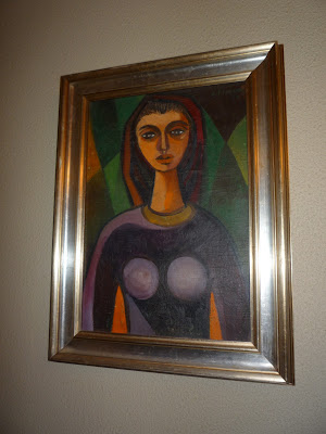 Esta pintura a óleo sobre tela é a minha preferida cá em casa e vou deixá-la aqui convosco durante um período em que, não estando ausente, vou estar impossibilitada de alimentar este blogue com regularidade. Adoro a beleza serena e triste desta mulher, e o jogo das cores, assim como o geometrismo das formas, conferem ao quadro um grande impacto visual. Mas não é só por isso que ele tem um significado especial para mim.