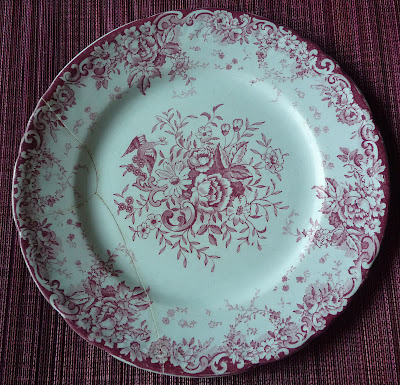 Deste motivo de Sacavém tenho apenas um prato a verde, em muito mau estado, mas a cafeteira lembrou-me de imediato uma sua congénere inglesa que tenho, da mesma época, também periforme e seguindo a mesma opção decorativa, já que ambas apresentam três faixas estampadas, ornadas com florões ou medalhões e arabescos (na inglesa só duas estão assim decoradas) com localização semelhante no corpo das peças.