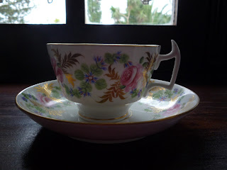 Chávena e pires de chá da fábrica de King Street, comprados na feira de Portobello Road em Londres. O formato aqui é o chamado London shape, largamente utilizado durante o séc. XIX.